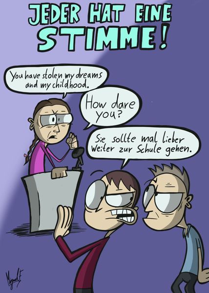 Auch für dieses Jahr hatte der schuleigene Comic-Künstler und Zehntklässler Miguel Fischerein Comic-Bild zum Motto des Gottesdienstes kreiert: Diesmal eine witzige und kritische Darstellung über Greta, die am Freitag doch besser in den Schulunterricht gehen sollte ...
